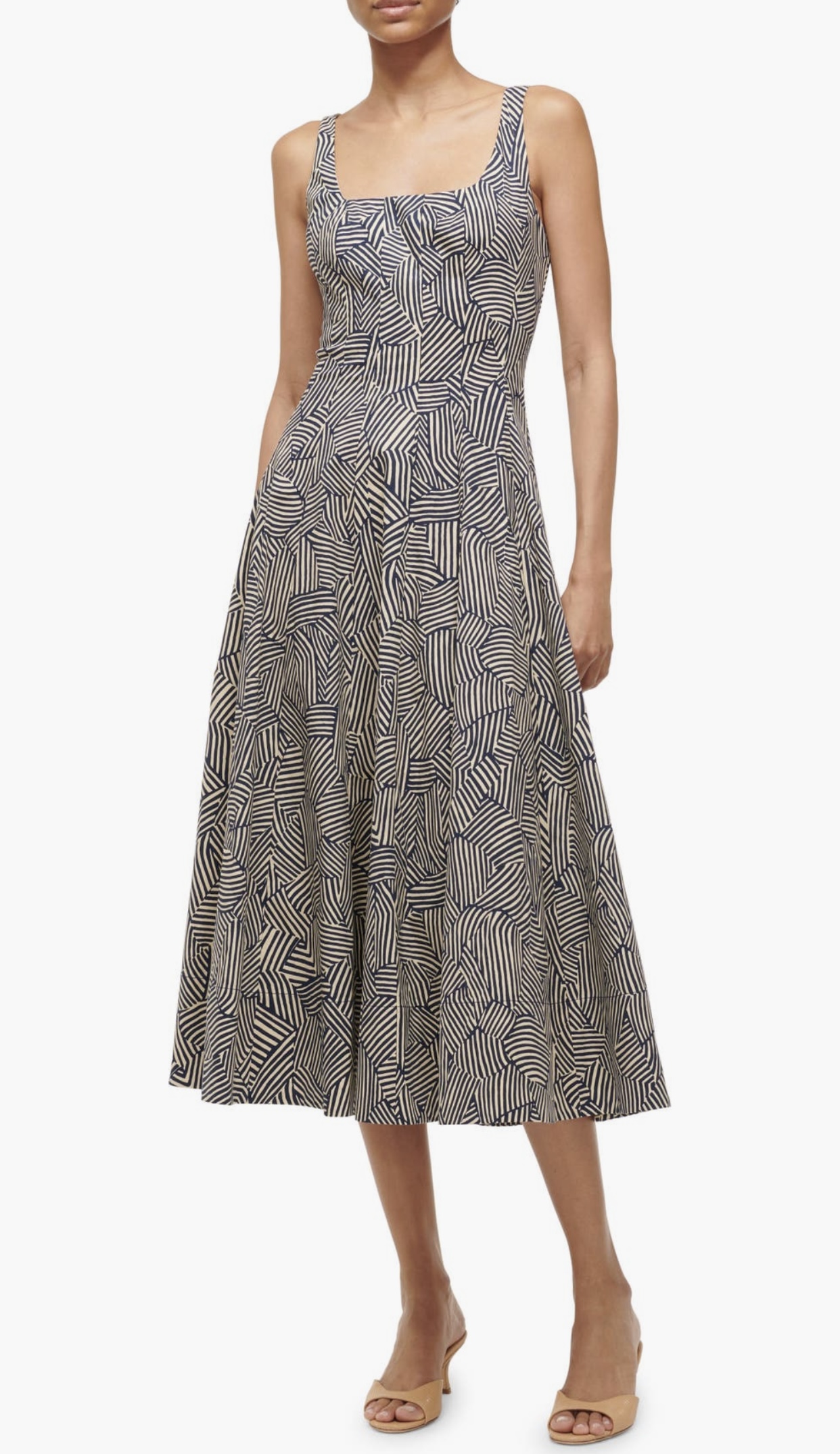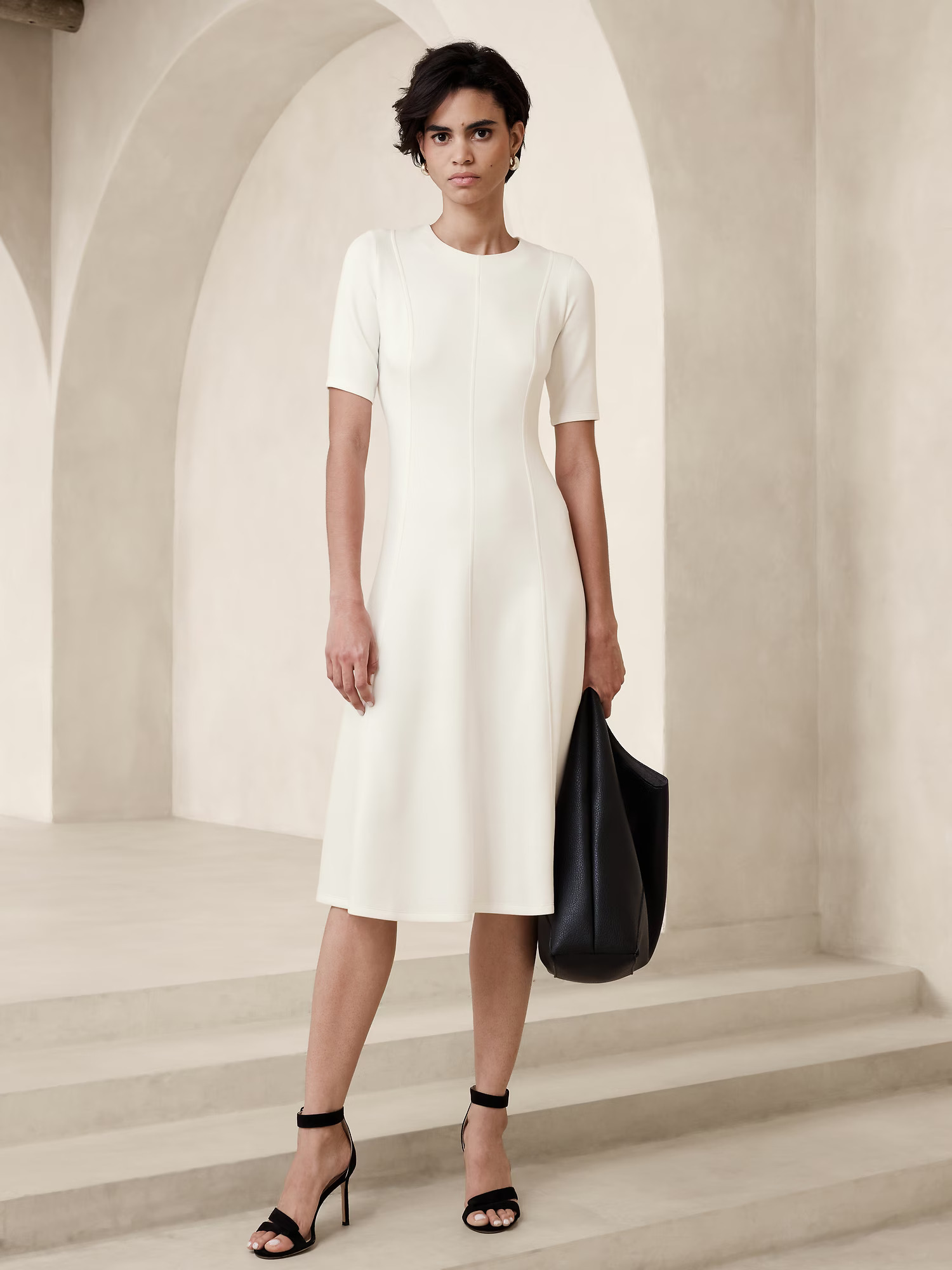 This flare dress gives Jackie Kennedy & Victoria Beckham vibes. In fact, I’m pretty sure I saw Victoria Beckham wear almost this exact dress with black oversized sunglasses and elegant pointed toe pumps. Perfect for more conservative workplaces, including law or investment banking firms.