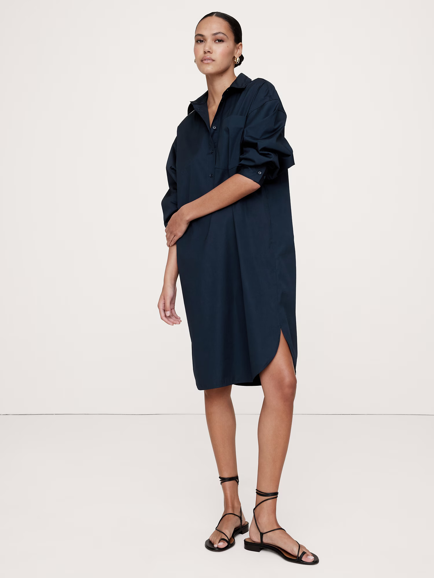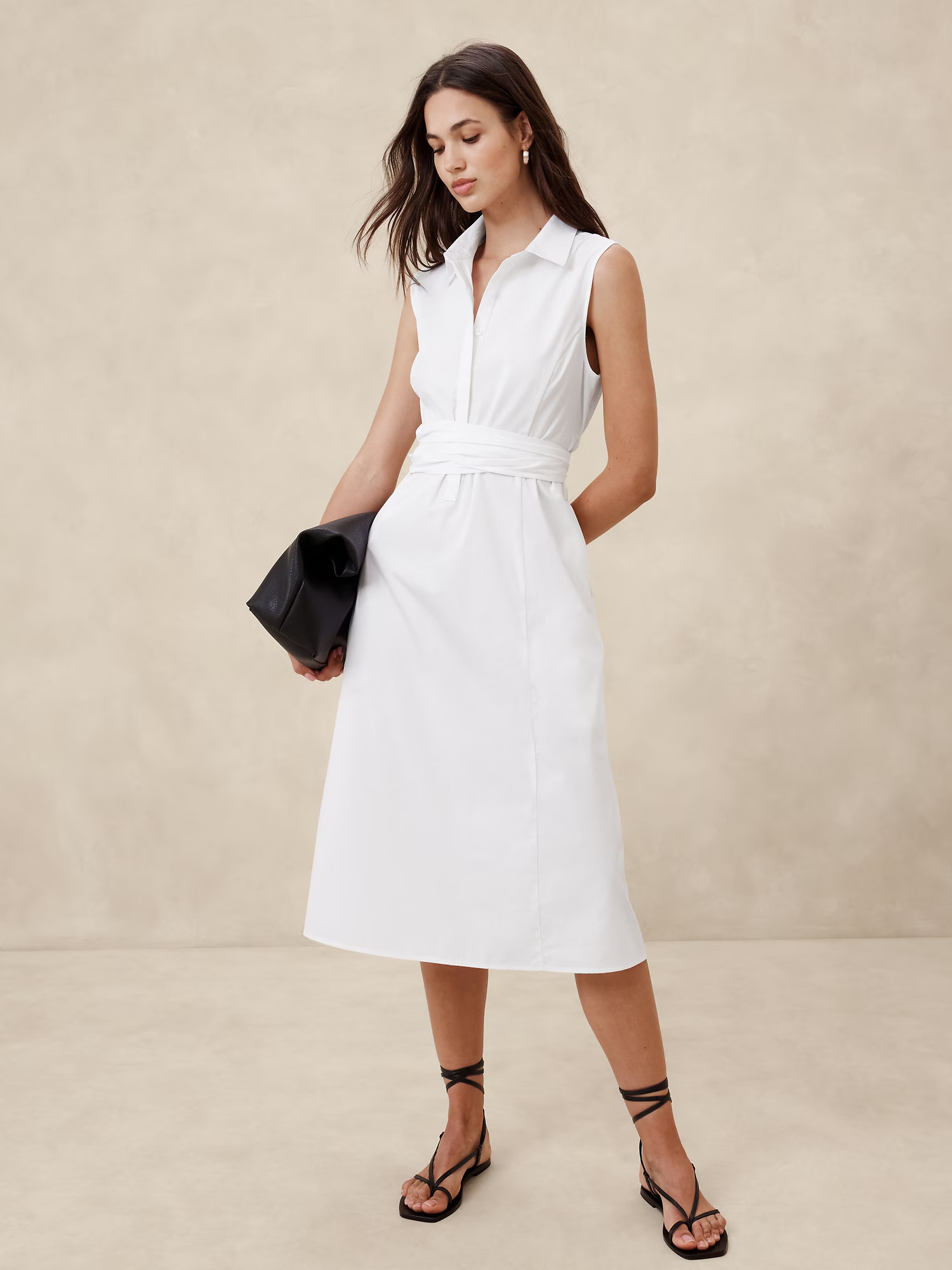 Shirtdresses are so versatile, and perfect for both casual and work settings. Thanks to its sleeveless nature, you’ll be able to cool down quickly when it’s hot outside. The dark blue tone would pair beautifully with tan/nude or black accessories.