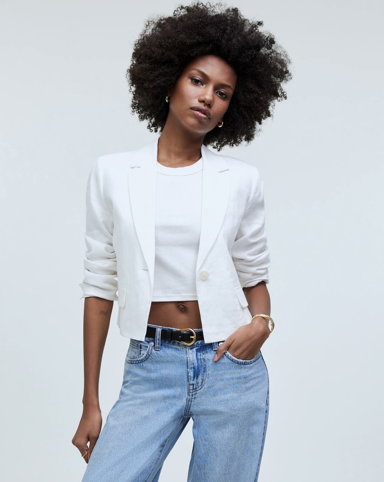 A cropped white linen blazer- what more would you need to make your dress more polished on a warm summer day to step into the office? Although linens are trending this season, this is a classic piece you can keep in your closet forever.
